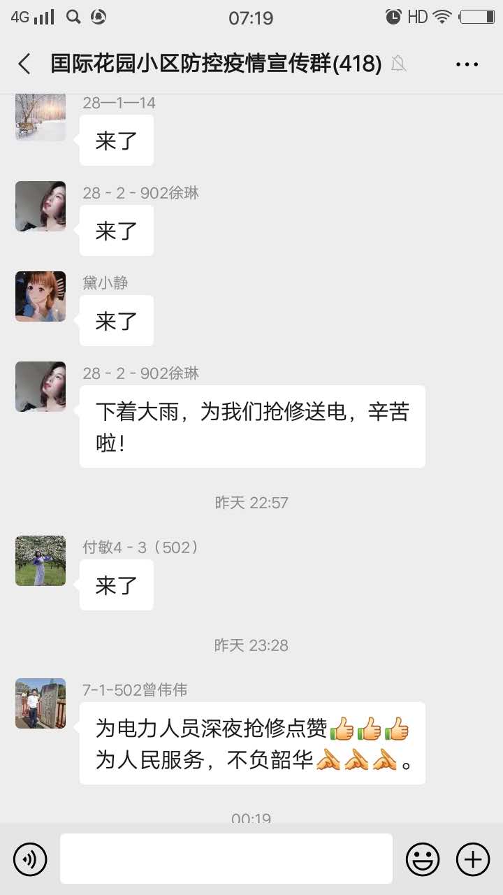 中國電力網(wǎng)訊 客戶又一次在微信群里表揚國網(wǎng)南豐縣供電公司搶修人員“為人民服務(wù),不負韶華,”并為他們點贊。