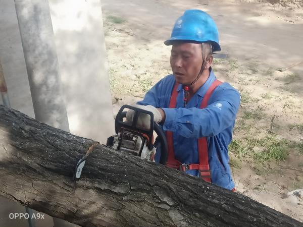 在現(xiàn)場(chǎng),工作電鋸的呲呲聲、斧頭的敲打聲、腳扣攀登電桿的噠噠聲......每位工作人員全然顧不上天氣的悶熱,井然有序的全身心投入,“高空”開(kāi)展伐樹(shù)、修剪作業(yè),不一會(huì)汗水就濕透了衣背。