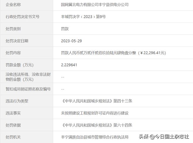 據(jù)河北省承德市豐寧滿族自治縣城市管理綜合行政執(zhí)法局5月29日公布的“豐城罰決字﹝2023﹞第9號”行政處罰信息顯示,國網(wǎng)冀北電力有限公司豐寧縣供電分公司因未按照建設(shè)工程規(guī)劃許可證內(nèi)容進(jìn)行建設(shè),被處以罰款2.229641萬元。