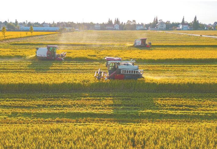 10月30日,在江蘇省海安市開發(fā)區(qū)品建村的洋蠻河高標準農田示范區(qū),南通季和智慧農業(yè)有限公司的1800多畝水稻收割工作有序進行。俯瞰大地,金黃的稻田綿延成片,多臺收割機穿梭其中。