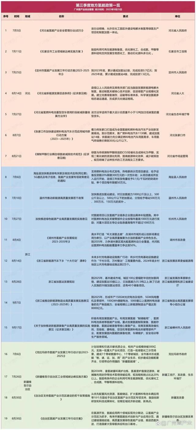 9月17日,浙江省嵊州市人民政府發(fā)布了《關(guān)于加快推進(jìn)新能源裝備產(chǎn)業(yè)高質(zhì)量發(fā)展的實(shí)施意見(jiàn)(征求意見(jiàn)稿)》。其中提到,積極布局發(fā)展氫能產(chǎn)業(yè)。布局發(fā)展氫能“制儲(chǔ)輸用”、氫燃料電池系統(tǒng)等氫能產(chǎn)業(yè)鏈。9月14日,山東省能源局發(fā)布了《關(guān)于開(kāi)展能源綠色低碳轉(zhuǎn)型試點(diǎn)示范建設(shè)工作的通知》。文件中涉及到氫能的內(nèi)容有:鼓勵(lì)發(fā)展風(fēng)電、光伏發(fā)電制氫,培育可再生能源開(kāi)發(fā)利用新模式新業(yè)態(tài);積極推進(jìn)核能海水淡化、核能制氫等研究示范等。9月13日,佛山市人民政府印發(fā)了《佛山市碳達(dá)峰實(shí)施方案》的通知。方案中提到,重點(diǎn)發(fā)展氫能產(chǎn)業(yè)。牽頭推進(jìn)廣東燃料電池汽車(chē)示范應(yīng)用城市群建設(shè),強(qiáng)化城市群內(nèi)各市資源共享、優(yōu)勢(shì)互補(bǔ)。加強(qiáng)氫能基礎(chǔ)設(shè)施建設(shè)。推動(dòng)氫能示范應(yīng)用擴(kuò)面,促進(jìn)氫能產(chǎn)業(yè)要素集聚,培育引進(jìn)優(yōu)勢(shì)骨干企業(yè),實(shí)現(xiàn)氫能產(chǎn)業(yè)強(qiáng)鏈補(bǔ)鏈,打造大灣區(qū)氫能產(chǎn)業(yè)高地。持續(xù)推動(dòng)南海區(qū)“仙湖氫谷”、一汽解放南方新能源汽車(chē)基地等園區(qū)載體建設(shè)。到2025年,培育氫能及燃料電池企業(yè)超過(guò)170家,到2030年,培育氫能及燃料電池企業(yè)超過(guò)200家。......據(jù)廣州壹產(chǎn)業(yè)不完全統(tǒng)計(jì),截至9月25日,今年第三季度(7、8、9月),部委共發(fā)布15條與氫能相關(guān)的政策,地方則有23個(gè)省(市)發(fā)布了70條氫能政策,合計(jì)85條。