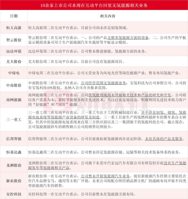 據(jù)財聯(lián)社不完全統(tǒng)計,恒大高新、智云股份、遠達環(huán)保、尤夫股份、中綠電、中南股份、南網(wǎng)能源、三一重工、信邦智能、恒基達鑫、龍洲股份、浙農(nóng)股份和安控科技在內(nèi)的13家上市公司本周在互動平臺無氫能源相關(guān)業(yè)務。具體情況如下圖: