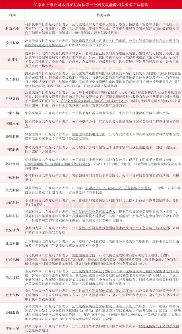 據(jù)財聯(lián)社不完全統(tǒng)計,科新機電、凌云股份、德固特、凱立新材、泛亞微透、中集車輛、國機汽車、駱駝股份、中儲股份、億緯鋰能、中核科技、凱龍股份、金能科技、昇輝科技、全柴動力、北京科銳、石化機械、圣元環(huán)保、金宏氣體、金博股份和津榮天宇在內(nèi)的21家上市公司本周在互動易等平臺回復氫能源相關(guān)業(yè)務情況。其中,德固特今日發(fā)布投資者機構(gòu)調(diào)研時表示,公司目前已經(jīng)參與并為制氫領(lǐng)域客戶提供過工藝裝備。凱立新材今日在互動平臺表示,公司在氫產(chǎn)業(yè)鏈布局的項目進展具體為:與制氫相關(guān)的PEM電解水制氫催化劑的在研項目達到完成百克級穩(wěn)定生產(chǎn)階段。具體情況如下圖:
