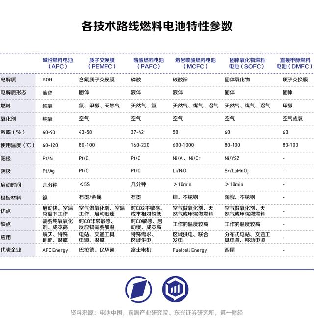 按電解質不同,氫燃料電池可分為質子交換膜燃料電池(PEMFC)、堿性燃料電池(AFC)、固體氧化物燃料電池(SOFC)、熔融碳酸鹽燃料電池(MCFC)、磷酸燃料電池(PAFC)等。