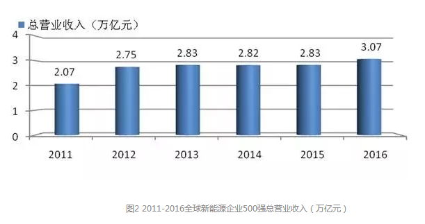 2016年“500強(qiáng)”企業(yè)的總營(yíng)業(yè)收入邁上一個(gè)新臺(tái)階,達(dá)到30666億元人民幣,首次突破3萬億元人民幣,比2015年的28329億元增加了2337億元人民幣。圖2給出了2011年至2016年全球新能源企業(yè)500強(qiáng)歷年的總營(yíng)業(yè)收入情況。