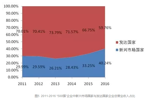 圖5則給出了2011-2016 “500強(qiáng)”企業(yè)中新興市場(chǎng)國家與發(fā)達(dá)國家企業(yè)總營(yíng)業(yè)收入占比情況。此圖更直觀的印證了上述趨勢(shì)。