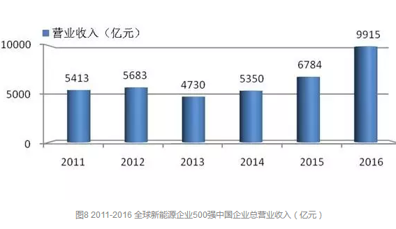 圖8給出了2011-2016年全球新能源企業(yè)500強(qiáng)中國企業(yè)總營(yíng)業(yè)收入的變化情況,由圖中可以看出,隨著中國在新能源產(chǎn)業(yè)投資的增加,特別是光伏電站裝機(jī)容量大幅增加,“500強(qiáng)”中中國企業(yè)的營(yíng)業(yè)收入增加也跟著增加,特別是這兩年這一趨勢(shì)更加明顯,這也凸顯了中國企業(yè)的競(jìng)爭(zhēng)力在增強(qiáng)。