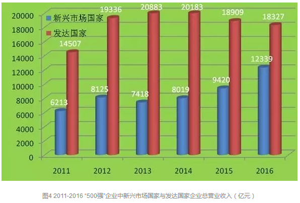 圖4給出了2011年至2016年“500強(qiáng)”企業(yè)中新興市場(chǎng)國家與發(fā)達(dá)國家企業(yè)營(yíng)業(yè)收入總和的變化情況。由圖中可以看出,