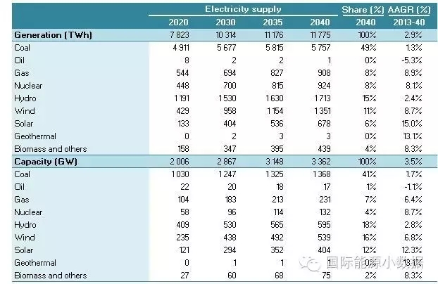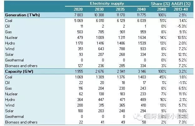 2040 年一次能源供應(yīng)達到46.95億噸標(biāo)油,其中煤炭占51%、石油16%、天然氣13%、核電5%、水電3%、非水可再生能源12%。從發(fā)電量來看,2040年總裝機達3145吉瓦,發(fā)電量達11.78萬億千瓦時,煤電占56%、天然氣發(fā)電9%、核電8%、水電13%、風(fēng)電8%、光伏3%、生物質(zhì) 3%。