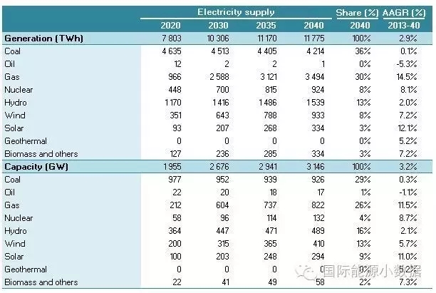 在大力推廣天然氣發(fā)電的情境下,2040年一次能源供應(yīng)為46.13億噸標(biāo)油,其中煤炭跌至40%、石油16%、天然氣高達23%、核電5%、水電3%、非水可再生能源13%。從發(fā)電量來看,2040年總裝機達3146吉瓦,發(fā)電量達11.78萬億千瓦時,煤電占36%、天然氣發(fā)電30%、核電8%、水電 13%、風(fēng)電8%、光伏3%、生物質(zhì)3%。