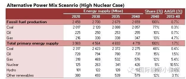 在大大提高能效的情境下,2040年一次能源供應(yīng)只有38.78億噸標(biāo)油,其中煤炭仍占48%、石油16%、天然氣11%、核電6%、水電3%、非水可再生能源14%。從發(fā)電量來看,2040年總裝機達2665吉瓦,發(fā)電量達9.39萬億千瓦時,煤電占51%、天然氣發(fā)電6%、核電10%、水電16%、風(fēng)電 10%、光伏4%、生物質(zhì)4%。