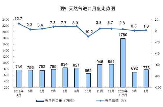 天然氣進(jìn)口小幅增長。4月份,進(jìn)口天然氣773萬噸,同比增長1.0%。1—4月份,進(jìn)口天然氣3233萬噸,同比增長1.5%。