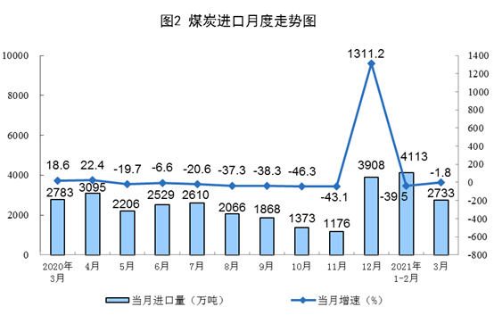 原煤生產(chǎn)小幅下降。3月份,生產(chǎn)原煤3.4億噸,同比下降0.2%,比2019年3月份增長9.4%,兩年平均增長4.6%,日均產(chǎn)量1099萬噸;進口煤炭2733萬噸,同比下降1.8%。