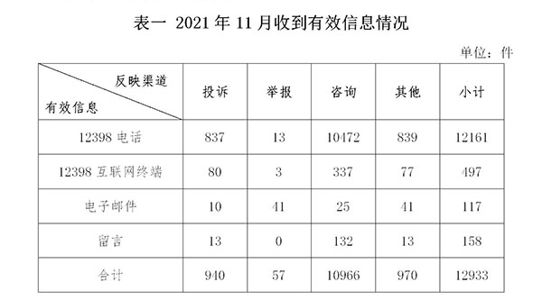 2021年11月,國(guó)家能源局12398能源監(jiān)管熱線(以下簡(jiǎn)稱12398熱線)共收到有效信息12933件(包含投訴、舉報(bào)、咨詢和其他訴求類別),環(huán)比增加21.81%,同比增加34.93%。(2021年11月收到有效信息情況見表一)