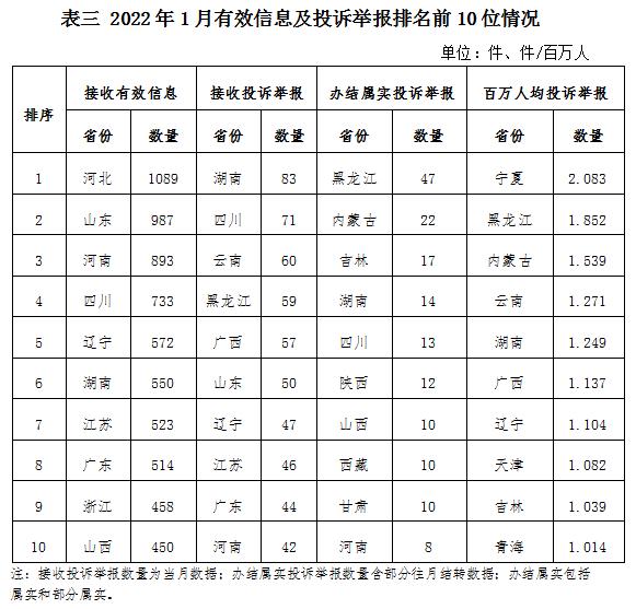 各省(自治區(qū)、直轄市)按照接收的有效信息數(shù)量排序,河北、山東、河南、四川、遼寧、湖南、江蘇、廣東、浙江、山西排在全國前10位;按照接收的投訴舉報數(shù)量排序,湖南、四川、云南、黑龍江、廣西、山東、遼寧、江蘇、廣東、河南排在全國前10位;按照辦結(jié)屬實的投訴舉報數(shù)量排序,黑龍江、內(nèi)蒙古、吉林、湖南、四川、陜西、山西、西藏、甘肅、河南排在全國前10位;按照百萬人均投訴舉報數(shù)量排序,寧夏、黑龍江、內(nèi)蒙古、云南、湖南、廣西、遼寧、天津、吉林、青海排在全國前10位。(2022年1月有效信息及投訴舉報排名前10位情況見表三)
