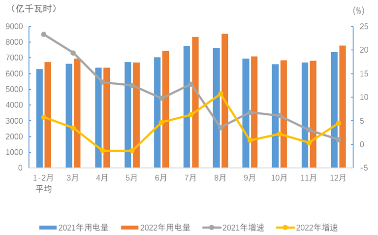 圖2 2021、2022年重點(diǎn)行業(yè)分月用電量情況