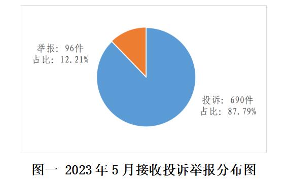 2023年5月,12398熱線共接收投訴舉報(bào)786件,環(huán)比增長(zhǎng)22.62%、同比下降19.63%。其中:投訴690件,環(huán)比增長(zhǎng)29.70%、同比下降22.47%;舉報(bào)96件,環(huán)比下降11.93%、同比增長(zhǎng)9.09%。