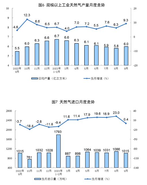 天然氣生產(chǎn)增速加快,進(jìn)口保持平穩(wěn)。9月份,生產(chǎn)天然氣179億立方米,同比增長(zhǎng)9.3%,增速比8月份加快3.0個(gè)百分點(diǎn),日均產(chǎn)量6.0億立方米。進(jìn)口天然氣1015萬噸,同比增長(zhǎng)0.4%,增速比8月份回落22.6個(gè)百分點(diǎn)。