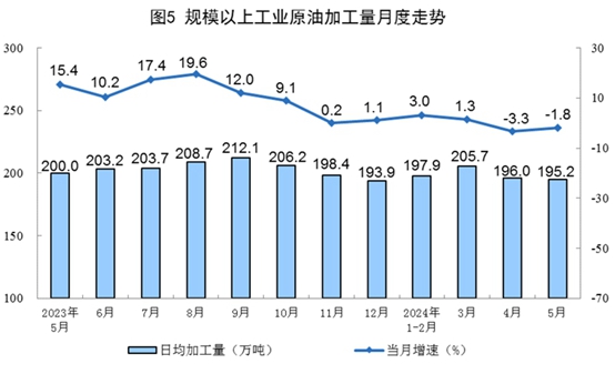 原油加工降幅收窄。5月份,規(guī)上工業(yè)原油加工量6052萬噸,同比下降1.8%,降幅比4月份收窄1.5個(gè)百分點(diǎn);日均加工195.2萬噸。1—5月份,規(guī)上工業(yè)原油加工量30177萬噸,同比增長0.3%。