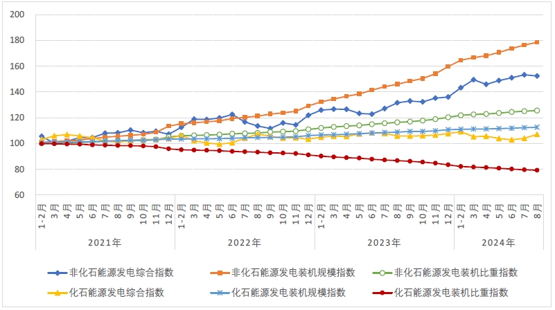 8月,非化石能源發(fā)電裝機規(guī)模指數(shù)為178.5,“十四五”以來非化石能源發(fā)電裝機規(guī)模累計增長了78.5%,同比增長22.2%。非化石能源發(fā)電裝機比重指數(shù)為125.6,“十四五”以來非化石能源發(fā)電裝機比重累計提升了25.6%(比重從2020年底的44.8%提高至2024年8月底的56.2%)。