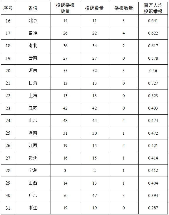 各省(自治區(qū)、直轄市)按照接收投訴舉報(bào)數(shù)量排序,四川、安徽、河南、河北、廣東排在全國前5位。按百萬人均投訴舉報(bào)數(shù)量排序,西藏、吉林、四川、天津、黑龍江排在全國前5位。(2024年8月全國接收投訴舉報(bào)地區(qū)分布情況見附件1)