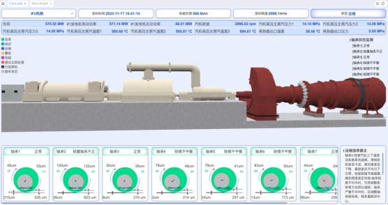 (兩張)圖注:系統(tǒng)主機(jī)首頁可集中顯示汽輪發(fā)電機(jī)組/輔機(jī)運行狀態(tài),實時監(jiān)視軸承振動水平、重要參數(shù)的變化情況