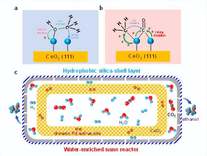 其中的水環(huán)境可以穩(wěn)定雙靶活性位點(diǎn),里邊的催化劑能夠在240℃、3MPa時將二氧化碳近100%選擇性高效穩(wěn)定地轉(zhuǎn)化為乙醇。