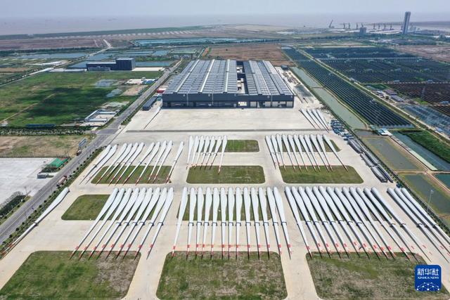 6月6日拍攝的位于射陽港低(零)碳產(chǎn)業(yè)園的射陽中車風(fēng)電葉片工程有限公司的外景照片(無人機(jī)照片)。新華社記者 楊磊 攝