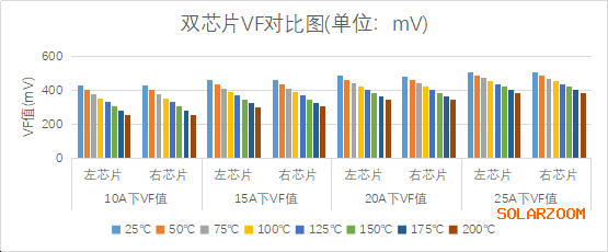 經(jīng)測(cè)試發(fā)現(xiàn),同一個(gè)晶圓上的2個(gè)芯片在封裝之后VF不超過3mV,這個(gè)差值在整個(gè)二極管的壓降中僅約1%,在測(cè)試誤差范圍之內(nèi),而《無法忽視的真相》一文中直接按50mV模擬分析,完全是脫離實(shí)際數(shù)據(jù)的猜想。