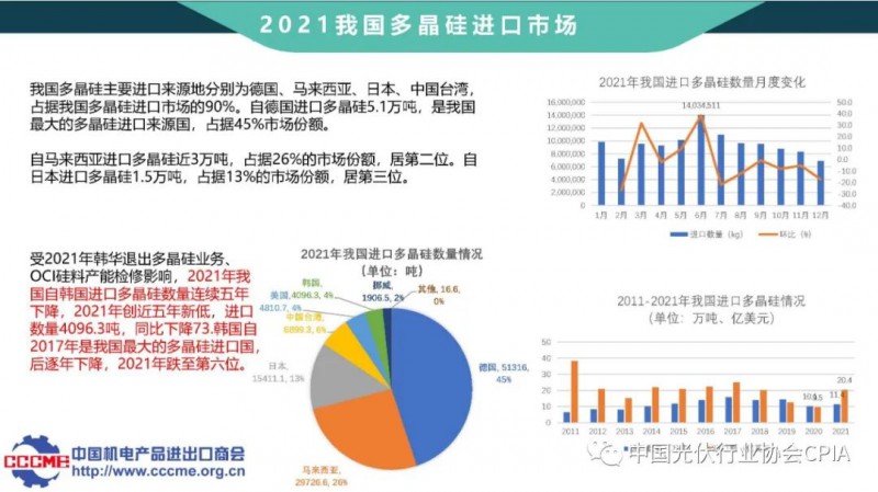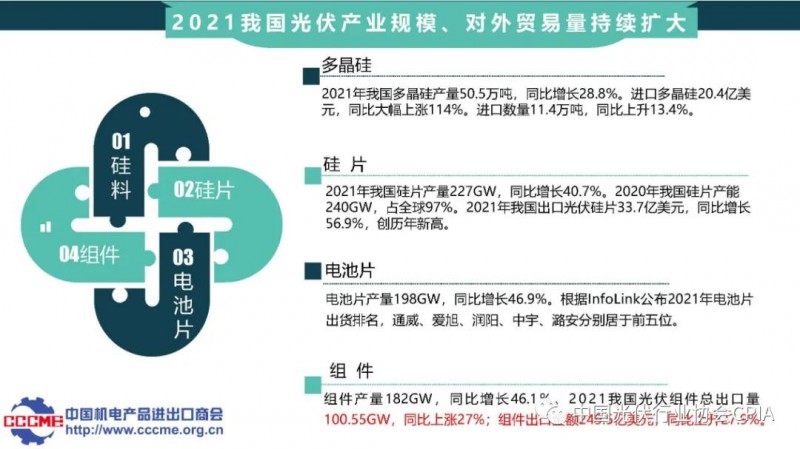中國(guó)機(jī)電產(chǎn)品進(jìn)出口商會(huì)光伏分會(huì)秘書(shū)長(zhǎng)張森介紹光伏產(chǎn)品國(guó)際貿(mào)易情況。2021年我國(guó)光伏產(chǎn)業(yè)規(guī)模、對(duì)外貿(mào)易量持續(xù)擴(kuò)大,行業(yè)發(fā)展主要痛點(diǎn)是光伏貿(mào)易摩擦再次升級(jí)、海運(yùn)費(fèi)和匯率大幅上漲等。