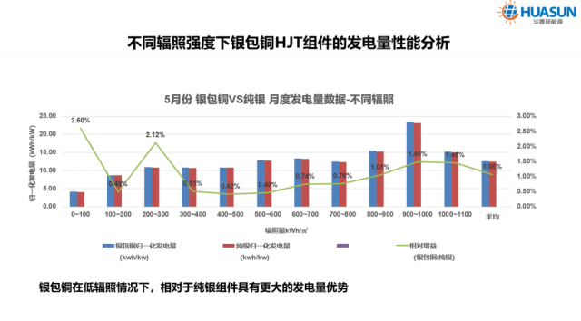 王文靜博士介紹,華晟的異質(zhì)結(jié)技術(shù)已經(jīng)發(fā)展至3.0階段,實現(xiàn)了雙面微晶異質(zhì)結(jié)電池的量產(chǎn),并通過銀包銅、0BB、電鍍銅等工藝,在保障產(chǎn)品可靠性的同時持續(xù)推動異質(zhì)結(jié)降本。去年下半年,公司已在異質(zhì)結(jié)電池的背面副柵中導(dǎo)入了銀包銅漿料,從測試數(shù)據(jù)來看,銀包銅組件較純銀組件仍有超1%的發(fā)電量增益,且這一發(fā)電量優(yōu)勢在高溫與低輻照環(huán)境下更加明顯。
