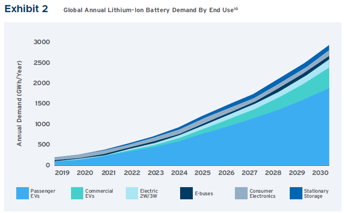 根據(jù)RMI公司的研究和彭博新能源財(cái)經(jīng)公司的分析,到2030年,全球?qū)︿囯x子電池的需求預(yù)計(jì)將達(dá)到每年2.8TW。其中大部分將滿足電動(dòng)汽車需求。