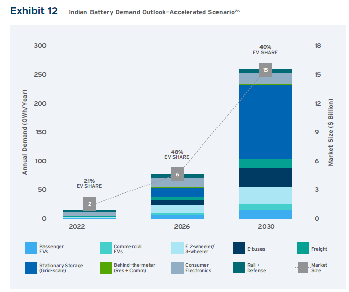 印度在先進(jìn)電池技術(shù)制造方面的影響力如今微不足道。然而,該國擁有大規(guī)模電池制造的巨大潛力。報(bào)告指出,到2030年,印度的電池市場可能超過150億美元(約合1.12萬億盧比),到2030年,印度的電池需求預(yù)計(jì)將在“加速情景”中上升到260GWh。