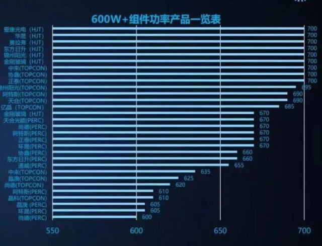 集邦新能源近期發(fā)布的一份行業(yè)報(bào)告則顯示,主流光伏企業(yè)已經(jīng)全面邁入600W+時(shí)代,而使用PERC、HJT、TOPCon等不同技術(shù)的600W+產(chǎn)品多達(dá)40余種。