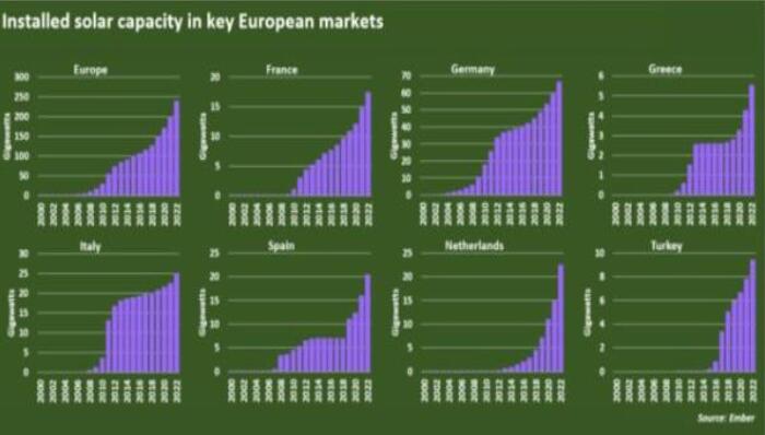 Ember 數(shù)據(jù)顯示,2022 年歐洲整體嵌入式太陽能發(fā)電量,較上年增長近 20%。該地區(qū)所有主要太陽能生產(chǎn)商均實現(xiàn)兩位數(shù)增長。
