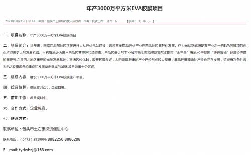 內(nèi)蒙古包頭擬建年產(chǎn)3000萬平方米EVA膠膜項(xiàng)目