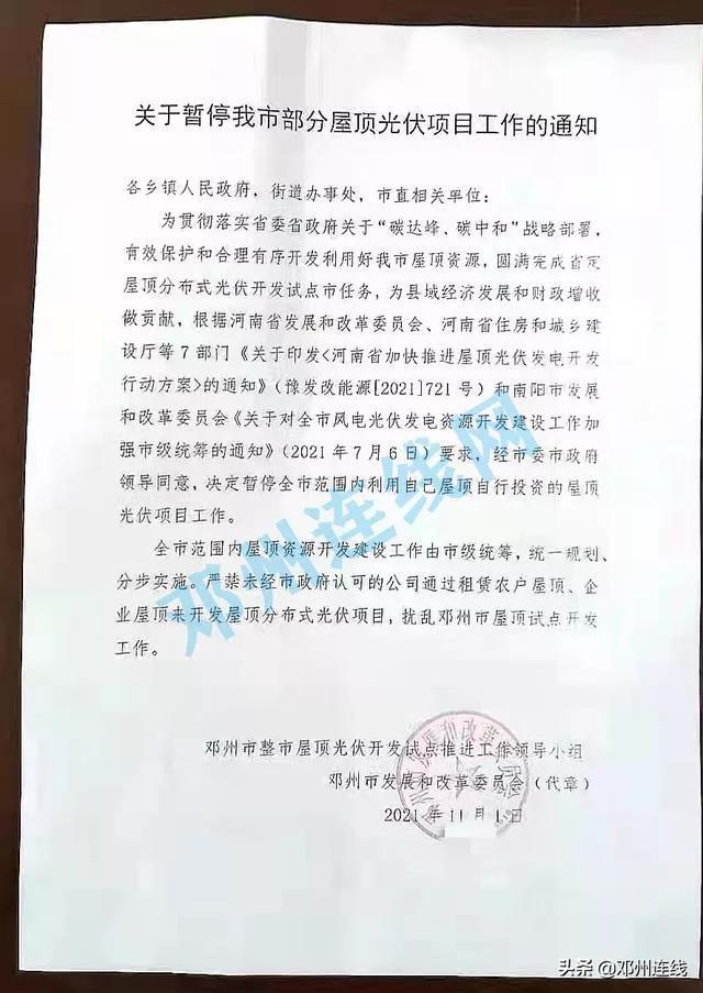 近日,有網(wǎng)友爆料稱,河南省鄧州市以整市屋頂光伏開發(fā)試點推進工作領(lǐng)導(dǎo)小組、市發(fā)改委的名義印發(fā)通知,暫停全市范圍內(nèi)利用自己屋頂自行投資的屋頂光伏項目工作。