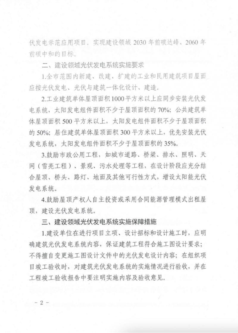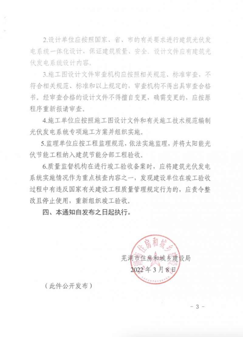 3月10日,安徽蕪湖市住建局發(fā)布關于加快建設領域光伏發(fā)電推廣應用的通知,通知指出,全市范圍內新建、改建、擴建的工業(yè)和民用建筑項目屋面應按光伏發(fā)電、光伏與建筑一體化設計、建造。其中,工業(yè)建筑單體屋頂面積1000平方米以上應同步安裝光伏發(fā)電系統(tǒng),太陽發(fā)電組件面積不少于屋頂面積的70%。