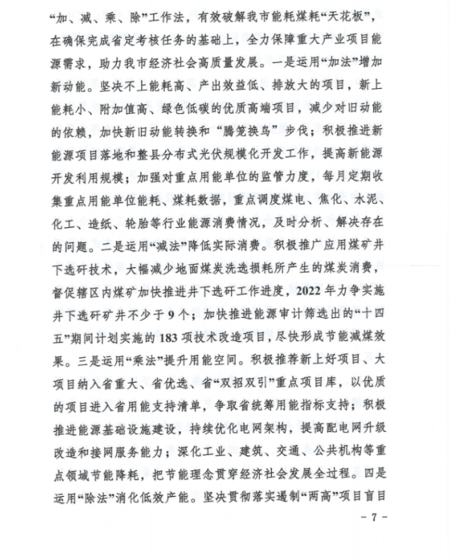 3、能源節(jié)約方面:2022年重點從“加、減、乘、除”四個層面逐步破解能耗、煤耗“天花板”問題,確保完成2022年省下達(dá)濟(jì)寧市煤炭消費(fèi)壓減和能耗強(qiáng)度任務(wù)目標(biāo)。