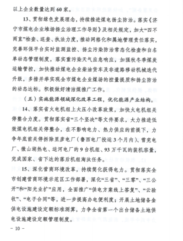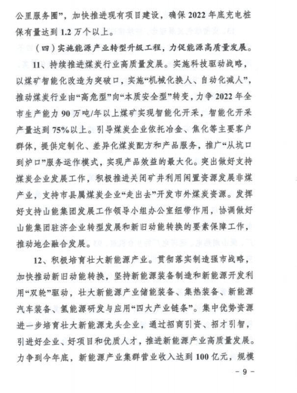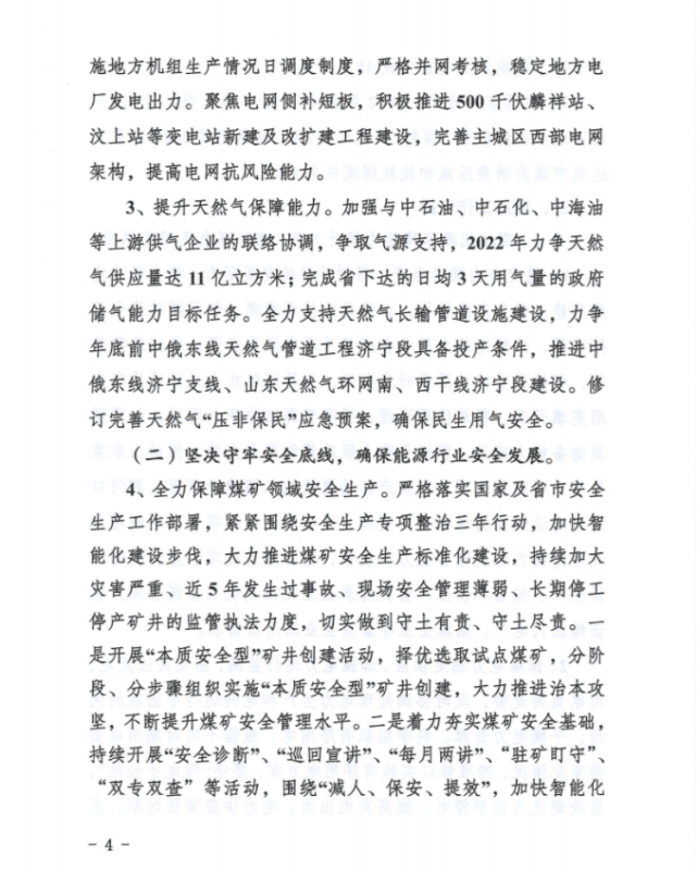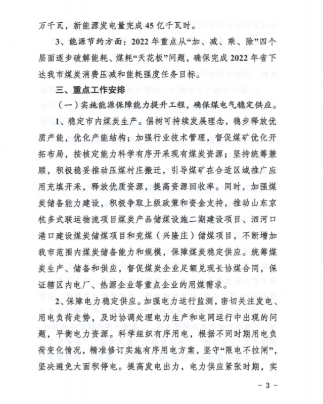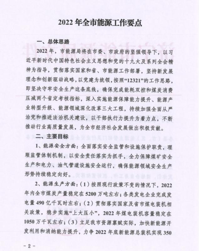 2、能源生產(chǎn)方面:(1)按照現(xiàn)行政策不變的情況下,2022年內(nèi)全市煤炭產(chǎn)量穩(wěn)定在5200萬噸左右;各類發(fā)電企業(yè)完成發(fā)電量490億千瓦時左右;(2)貫徹落實國家及省市煤電裝機(jī)相關(guān)政策,穩(wěn)步實施“上大壓小”,2022年煤電裝機(jī)容量穩(wěn)定在1050萬千瓦左右;(3)立足濟(jì)寧市資源稟賦實際,加快新能源開發(fā)利用和消納能力提升,力爭2022年底新能源總裝機(jī)實現(xiàn)350萬千瓦,新能源發(fā)電量完成45億千瓦時。