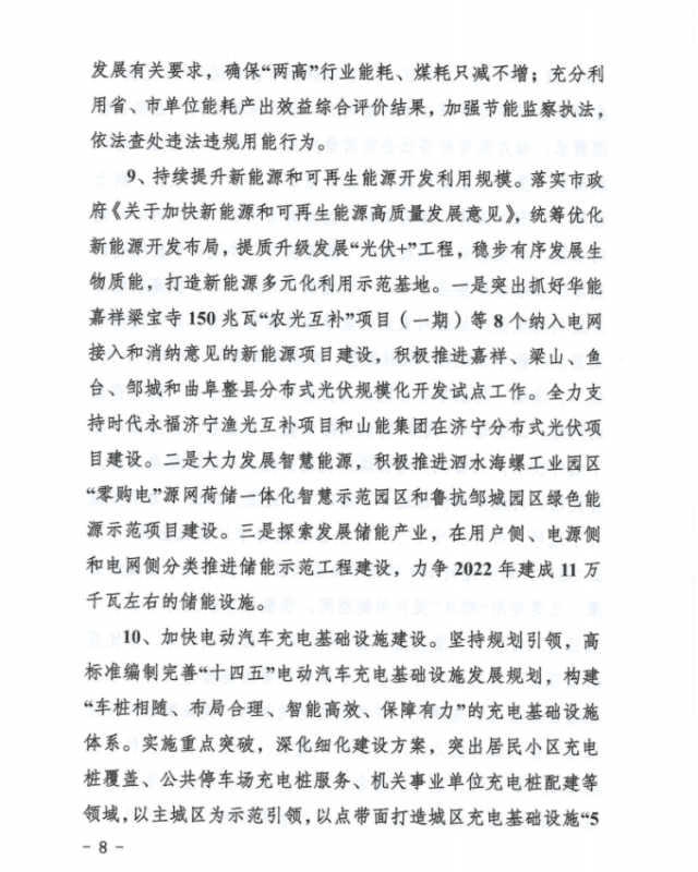 持續(xù)提升新能源和可再生能源開發(fā)利用規(guī)模。落實市政府《關(guān)于加快新能源和可再生能源高質(zhì)量發(fā)展意見》,統(tǒng)籌優(yōu)化新能源開發(fā)布局,提質(zhì)升級發(fā)展“光伏+”工程,穩(wěn)步有序發(fā)展生物質(zhì)能,打造新能源多元化利用示范基地。一是突出抓好華能嘉祥梁寶寺150兆瓦“農(nóng)光互補(bǔ)”項目(一期)等8個納入電網(wǎng)接入和消納意見的新能源項目建設(shè),積極推進(jìn)嘉祥、梁山、魚臺、鄒城和曲阜整縣分布式光伏規(guī)?;_發(fā)試點工作。全力支持時代永福濟(jì)寧漁光互補(bǔ)項目和山能集團(tuán)在濟(jì)寧分布式光伏項目建設(shè)。二是大力發(fā)展智慧能源,積極推進(jìn)泗水海螺工業(yè)園區(qū)“零購電”源網(wǎng)荷儲一體化智慧示范園區(qū)和魯抗鄒城園區(qū)綠色能源示范項目建設(shè)。三是探索發(fā)展儲能產(chǎn)業(yè),在用戶側(cè)、電源側(cè)和電網(wǎng)側(cè)分類推進(jìn)儲能示范工程建設(shè),力爭2022年建成11萬千瓦左右的儲能設(shè)施。