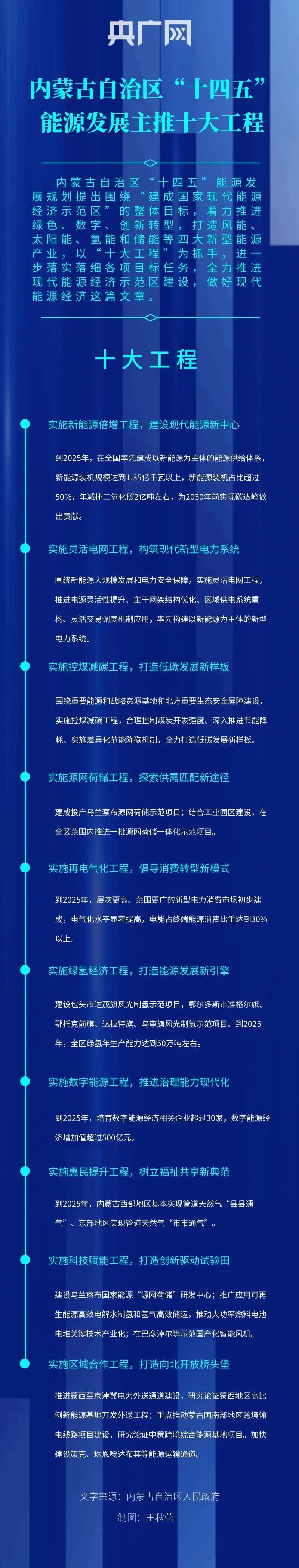 “十四五”時期,內蒙古將以建設國家現(xiàn)代能源經(jīng)濟示范區(qū)為總體目標,推進能源和戰(zhàn)略資源基地優(yōu)化升級。具體工作中,將依托能源基地建設,以資源和市場換產業(yè),開展新型能源產業(yè)關鍵裝備及其零部件制造,打造風能、太陽能、氫能、儲能四大新型能源產業(yè),以“十大工程”為抓手,進一步落實落細各項目標任務,全力推進現(xiàn)代能源經(jīng)濟示范區(qū)建設,做好現(xiàn)代能源經(jīng)濟這篇文章。