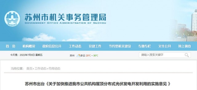 近日,蘇州市機(jī)關(guān)事務(wù)管理局、蘇州市發(fā)展和改革委員會(huì)聯(lián)合發(fā)布《關(guān)于加快推進(jìn)我市公共機(jī)構(gòu)屋頂分布式光伏發(fā)電開(kāi)發(fā)利用的實(shí)施意見(jiàn)》(下稱(chēng)“意見(jiàn)”),這是全面貫徹黨中央、國(guó)務(wù)院和省委、省政府關(guān)于碳達(dá)峰碳中和決策部署的具體行動(dòng),也是落實(shí)省機(jī)關(guān)事務(wù)工作年度會(huì)議精神的重要抓手。