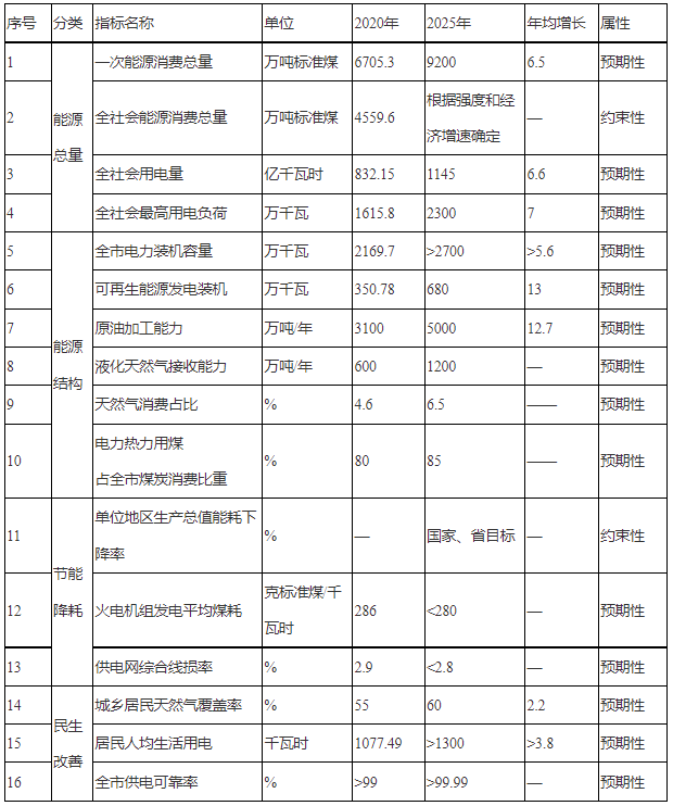 2.結(jié)構(gòu)目標(biāo)。到2025年,全市電力裝機(jī)容量達(dá)到2700萬(wàn)千瓦以上,其中,可再生能源發(fā)電裝機(jī)容量達(dá)到680萬(wàn)千瓦以上,清潔能源發(fā)電裝機(jī)占電力總裝機(jī)容量達(dá)到45%以上;原油加工能力達(dá)到5000萬(wàn)噸/年,液化天然氣接收能力達(dá)到1200萬(wàn)噸/年;全市能源消費(fèi)結(jié)構(gòu)進(jìn)一步優(yōu)化,天然氣消費(fèi)占比力爭(zhēng)達(dá)到6.5%;電力熱力用煤占全市煤炭消費(fèi)比重達(dá)到85%以上。