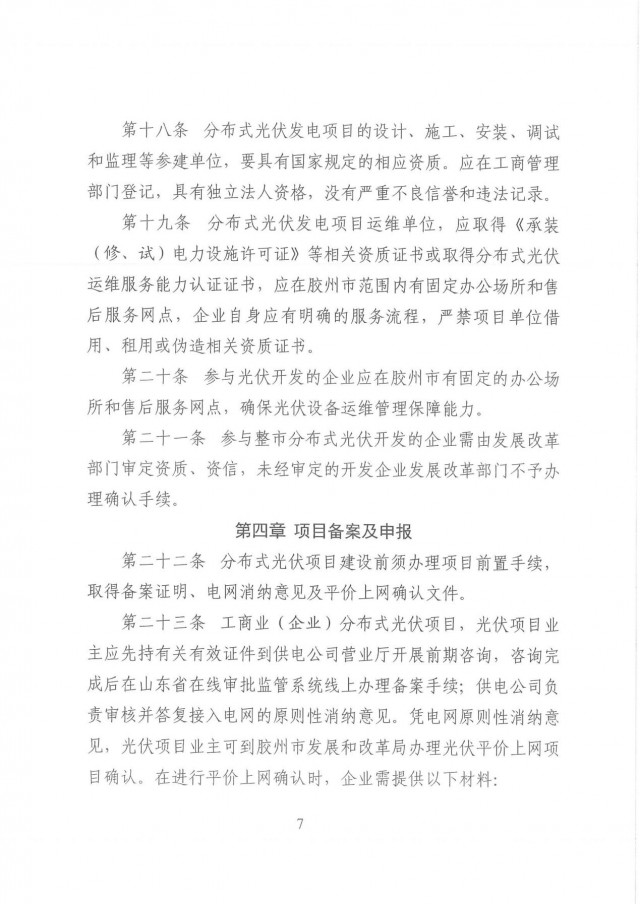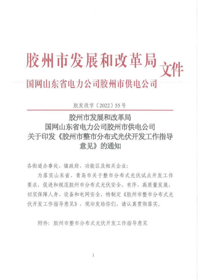 同時圍繞新型電力系統(tǒng)構(gòu)建,打造“綠色低碳”新膠州,鼓勵“光伏+工業(yè)”“光伏+農(nóng)業(yè)”、“光伏+儲能”等多種形式的“光伏+產(chǎn)業(yè)”發(fā)展,積板推進(jìn)“農(nóng)村新能源合作社”、“分布式光伏示范村”、“分布式光伏示范園區(qū)”、“分布式光伏示范企業(yè)”的建設(shè),形成可復(fù)制、可推廣的經(jīng)驗(yàn)。高效推進(jìn)膠州市分布式光伏建設(shè)發(fā)展,為推進(jìn)分布式光伏規(guī)模化開發(fā)工作提供“膠州模式”。