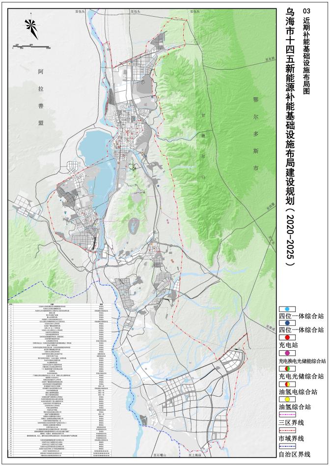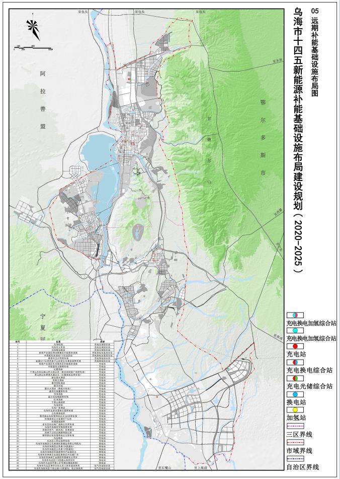 規(guī)劃范圍為全烏海市域范圍,總面積1754平方公里,主要涉及濱河新區(qū)、 海勃灣中心城區(qū)、烏達中心城區(qū)、海南中心城區(qū)和工業(yè)園區(qū)、物流園區(qū)內的充電樁布局、換電站布局、加氫站布局和光伏儲能一體化設施布局。