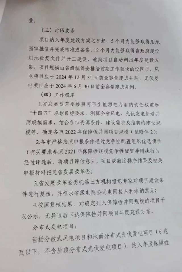 并網(wǎng)時限要求方面文件要求:保障性項目納入年度建設(shè)方案之日起,5個月內(nèi)能夠取得用地預(yù)審批復(fù)并完成核準(zhǔn)或備案,12個月內(nèi)能夠取得省政府建設(shè)用地批復(fù)文件并開工建設(shè),逾期項目自動調(diào)出年度建設(shè)方案,項目規(guī)模由省級統(tǒng)籌安排給前期工作較快的設(shè)區(qū)市。風(fēng)電項目應(yīng)于2024年12月31日前全容量建成并網(wǎng),光伏發(fā)電項目應(yīng)于2024年6月30日前全容量建成并網(wǎng)。