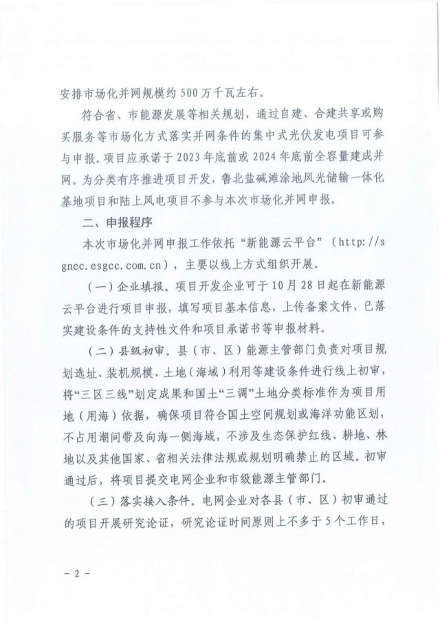 根據(jù)文件,綜合考慮可再生能源電力消納責(zé)任權(quán)重,2022年全省安排市場化并網(wǎng)規(guī)模約500萬千瓦左右,本批項目應(yīng)承諾于2023年底前或2024年底前全容量建成并網(wǎng)。另外,魯北鹽堿灘涂地風(fēng)光儲輸一體化基地項目和陸上風(fēng)電項目不參與本次市場化并網(wǎng)申報。