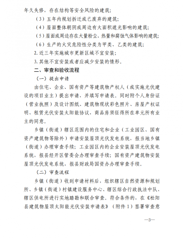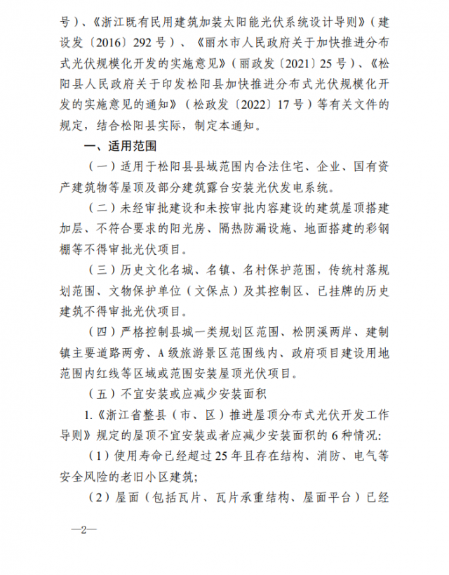 1、適用范圍:適用于松陽(yáng)縣縣域范圍內(nèi)合法住宅、企業(yè)、國(guó)有資產(chǎn)建筑物等屋頂及部分建筑露臺(tái)安裝光伏發(fā)電系統(tǒng),并說明補(bǔ)充5類不得安裝或不宜安裝及減少安裝的情形。