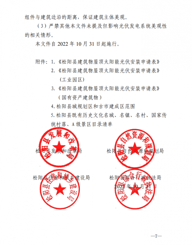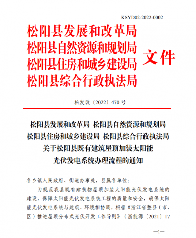 11月8日,浙江松陽(yáng)縣發(fā)展和改革局關(guān)于松陽(yáng)縣既有建筑屋頂加裝太陽(yáng)能光伏發(fā)電系統(tǒng)辦理流程的通知印發(fā),通知對(duì)既有建筑屋頂加裝太陽(yáng)能光伏發(fā)電系統(tǒng)適用范圍、審查和驗(yàn)收流程以及規(guī)范要求做出詳細(xì)規(guī)定。